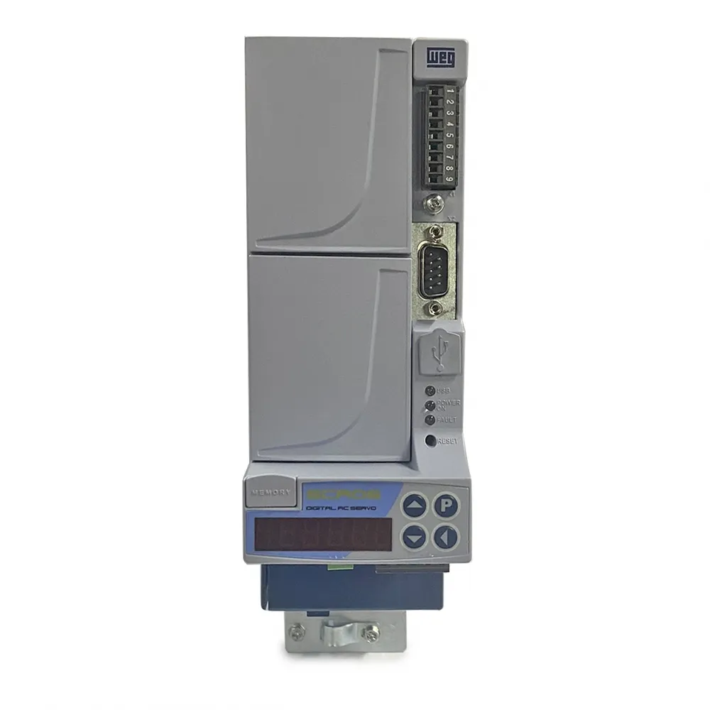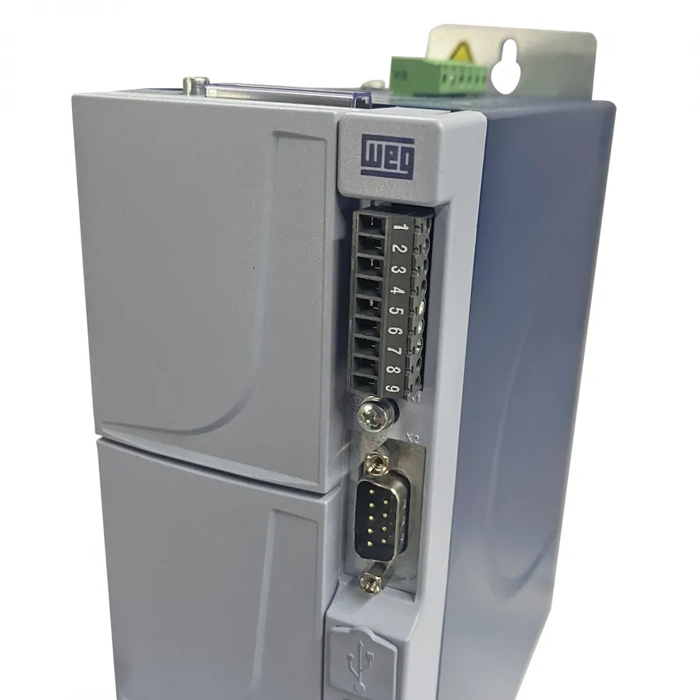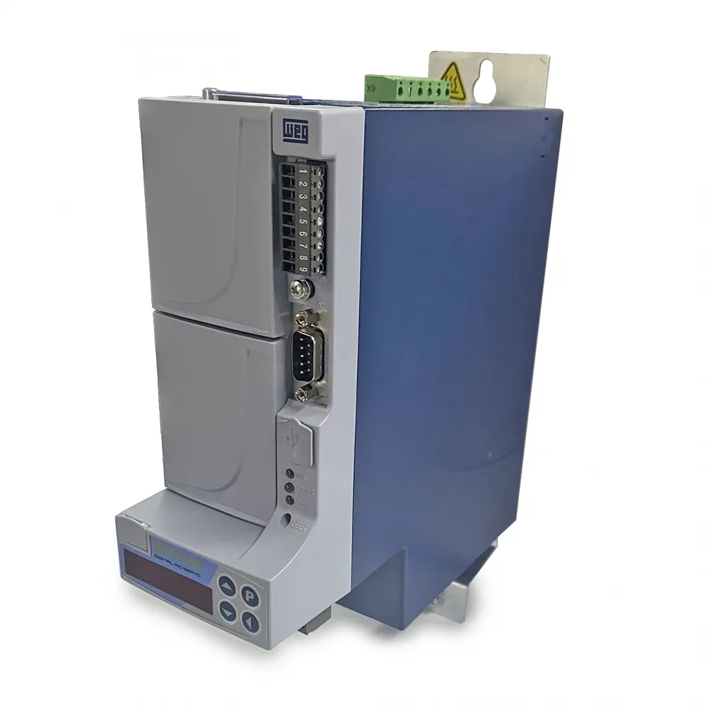 Possui interface de operação com display de LED´s de seis dígitos para comando, ajuste e visualização de todos os parâmetros e também excelente custo benefício, com função de CLP, blocos de posicionamento, software de programação gratuito e comunicação CANopen inclusa no produto padrão, podendo ser utilizado nos mais variados tipos de aplicações.